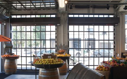 Aluminum Glass Door model 522 is designed in sizes up to 18’ 2” (5486 mm) wide and 14’ 1” (4318 mm) high. This aluminum full-view door, featuring a frameless design, is ideal for restaurants, auto dealerships and any application where the door needs to integrate seamlessly with the aesthetics of the building. Available with five glass options.