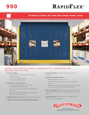 Our flexible bottom high speed interior fabric door, RapidFlex® 990, is ideal for high-traffic manufacturing, pharmaceutical, warehouse and distribution facilities. Built for safety this door features a flexible bottom with wireless monitored reversing edge, built-in drop stop device and in-plane infrared sensors.