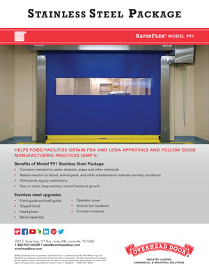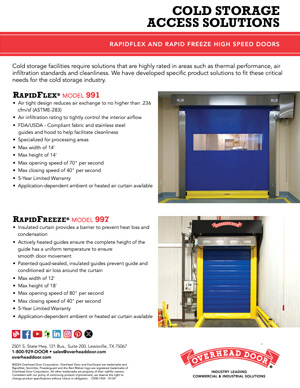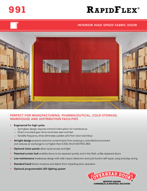 Our high speed interior fabric door, RapidFlex® Model 991, is ideal for separating controlled environment spaces such as food and beverage facilities, high traffic zones, storage rooms and manufacturing areas to prevent cross contamination. This door features dual recessed photo eyes and a patent-pending curtain lock which allows the door to withstand pressure and enables it to be repaired quickly in the field.