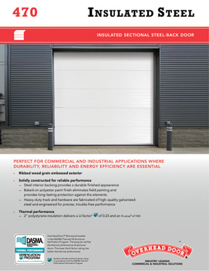Insulated sectional steel door model 470 is solidly constructed for reliable performance, the insulated sectional steel-back door, is perfect for commercial and industrial applications. The 2” polystyrene insulation delivers superior U-factor of 0.23 (R-value of 9.83).