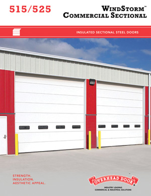WindStorm™ Commercial Sectional Door Model 515 is engineered to withstand higher design pressures and is designed to meet local building codes for wind speed. constructed of steel and polyurethane insulation, this insulated wind load sectional door boasts an U-factor of .15 (R-value of 12.12).