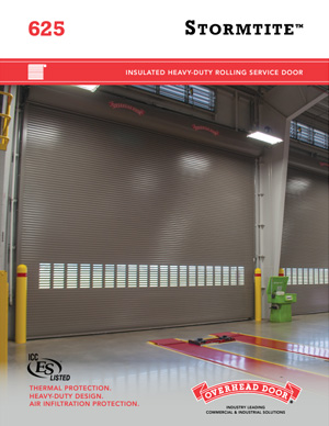 The Model 625 rolling steel doors are an insulated, heavy-duty rolling service door that is an ideal choice for applications requiring a moderate level of thermal protection. Designed in sizes up to 30’4″ wide and 28’4″ high (9246 mm and 8636 mm), these doors are constructed with a CFC-free, foamed-in-place polyurethane insulation. Vinyl weatherstripping on the bottom bar, exterior curtain-side guide and hood baffle provides additional protection against air infiltration.