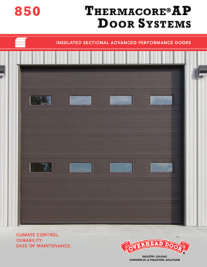 Thermacore® AP Door Model 850 is engineered to deliver advanced performance in commercial and industrial applications where climate control, durability and ease of maintenance are primary concerns. This sectional steel door system presents the most advanced thermal performance values published by any major US manufacturer of 3″ commercial insulated sectional doors.