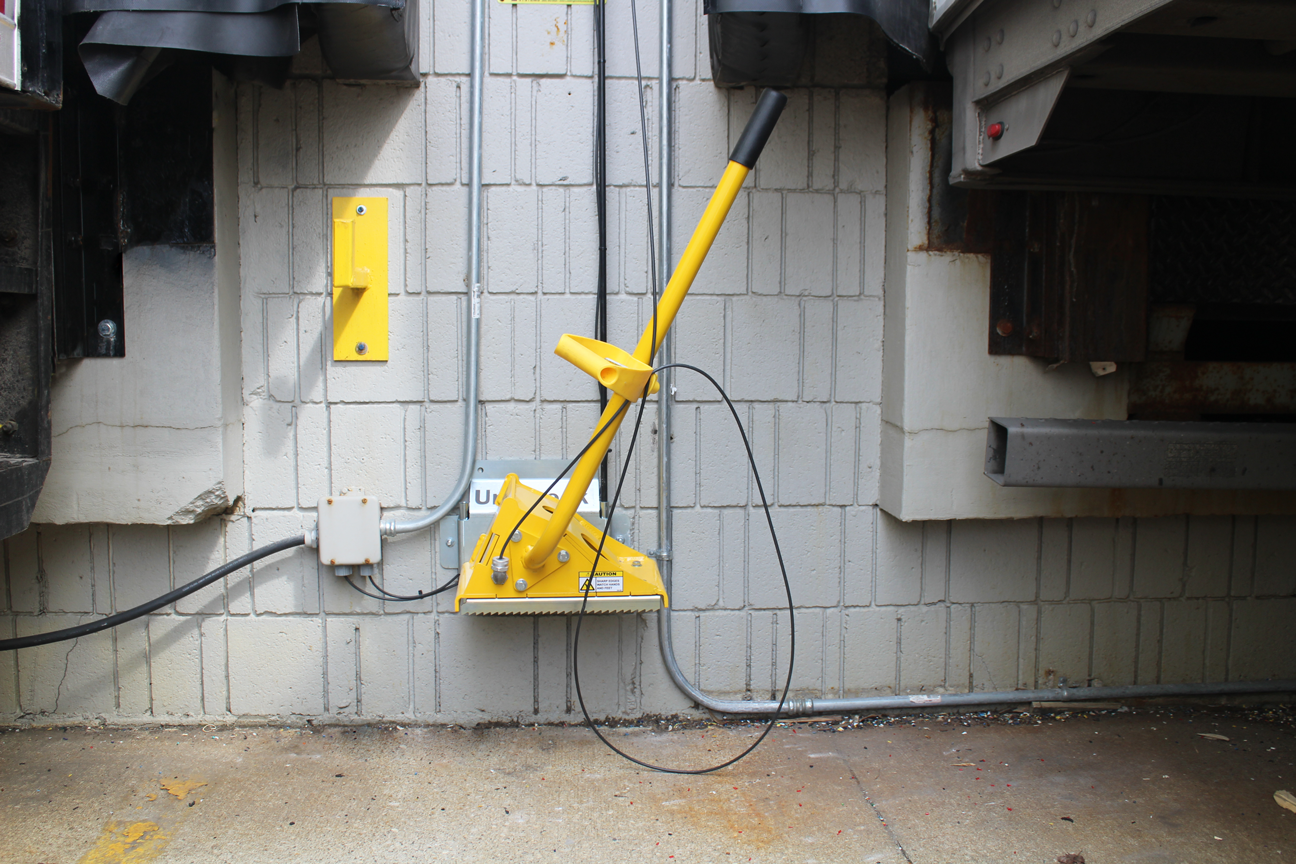Once a trailer is fully backed and parked in position against the dock bumpers, the UniChock is removed from the storage bracket and placed under the front of one of the trailer’s back tires. This will sound an audible indicator and display a message on the iDock Controller that the unit is in a safe position. The dock attendant can then proceed to open the door and deploy the leveler.